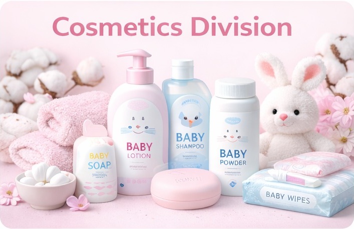 We have specialized baby care products, including powder, oil, soap, shampoo, and daily essential cosmetics.