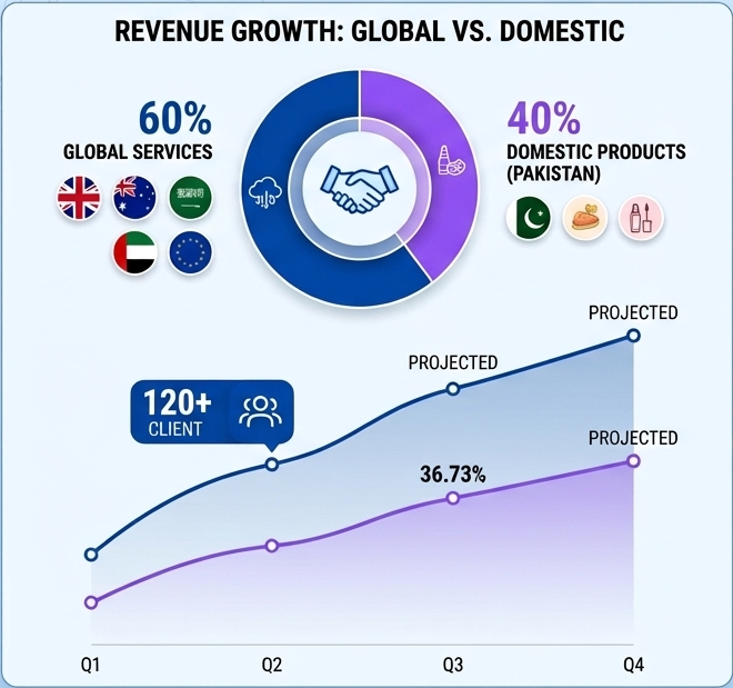 • Revenue Streams: 60% Global Financial Services / 40% Domestic Product Sales.