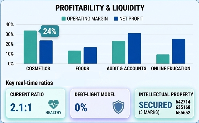 • Assets: Significant investment in Intellectual Property (Trademarks 642714, 635168, 655652) and digital infrastructure.