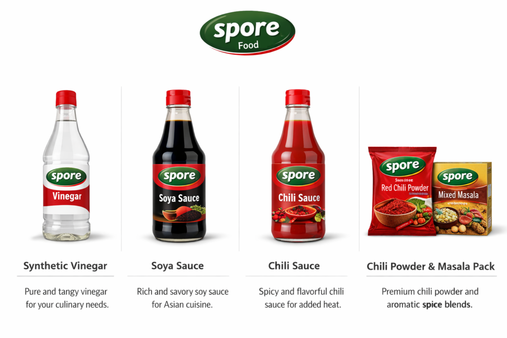 From synthetic vinegar and soya sauce to chili sauce, refined chili powder, and masala packs, Spore brings authentic taste in convenient retail packaging for households and food service needs alike.
