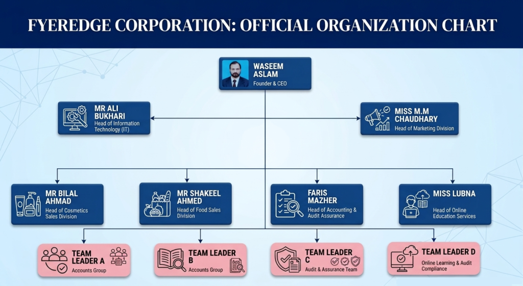 Fyeredge Corporation, under the leadership of Founder & CEO Waseem Aslam, is a multi-divisional enterprise bridging high-stakes financial services with diversified commerce. We operate with a dual-focus strategy: driving domestic growth through our physical divisions in Pakistan and providing elite, cloud-based financial expertise to the global market.
